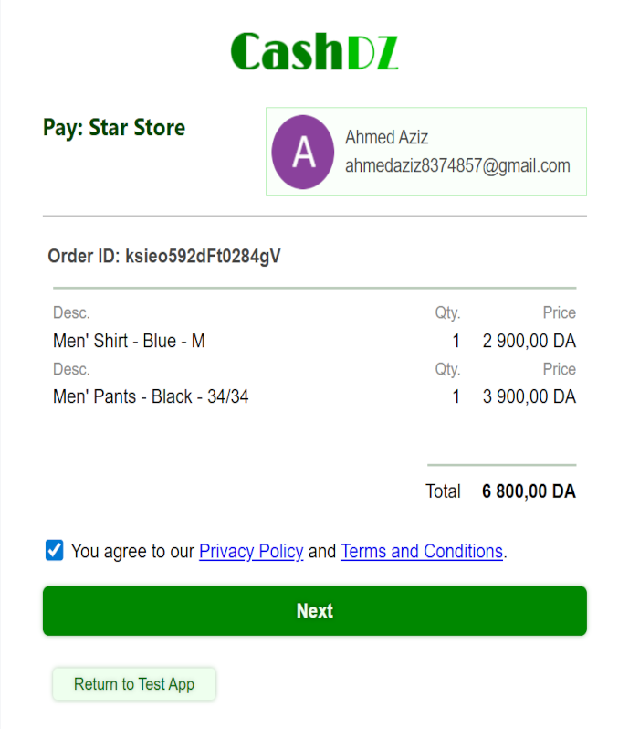 Once the customer completes the payment on Cash DZ, they are redirected to your return URL.
