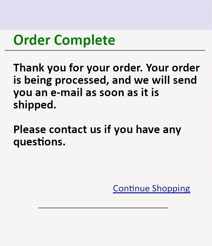 echo "Thank you for your order. Your order is being processed, and we will send you an email as soon as it is shipped";